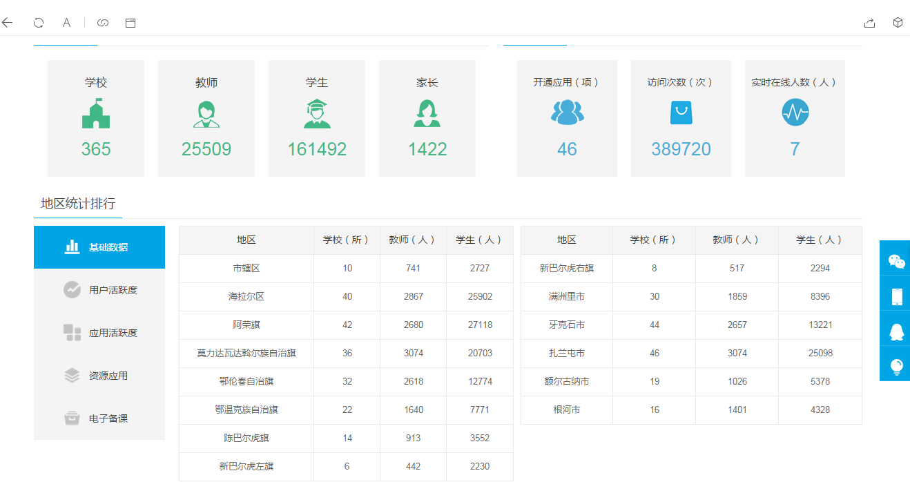 • 數據統計:支持學校可自定義時間段統計本校設備的使用率和老師的使用時間;支持周期統計(年月周)設備在班級的使用時長、設備告警,媒體推送的次數,資源上傳。